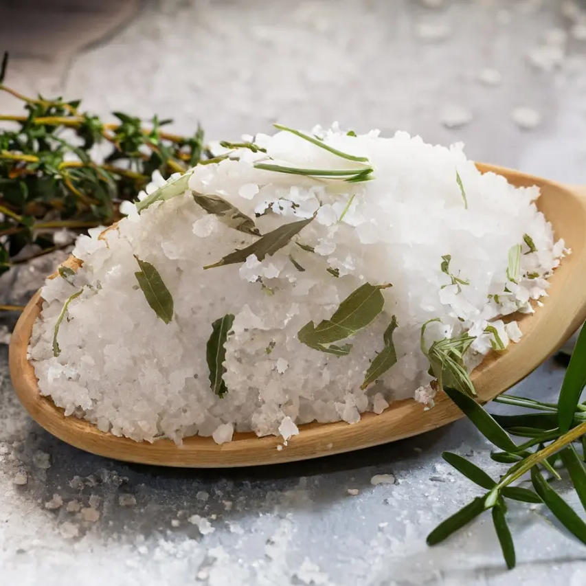 Fleur de sel de Camargue, thym sauvage, laurier sauvage, romarin sauvage.